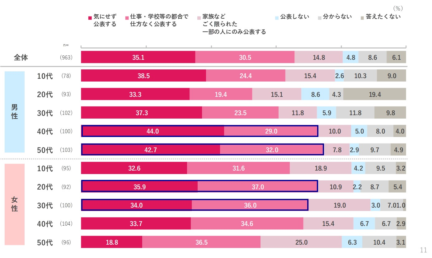全体で約7割弱の人が外部に公表すると選択。但し、「気にせず公表する」は35.1%にとどまり、「仕事・学校等の都合で仕方なく公表する」30.5%と積極的に公表する姿勢は見られない。