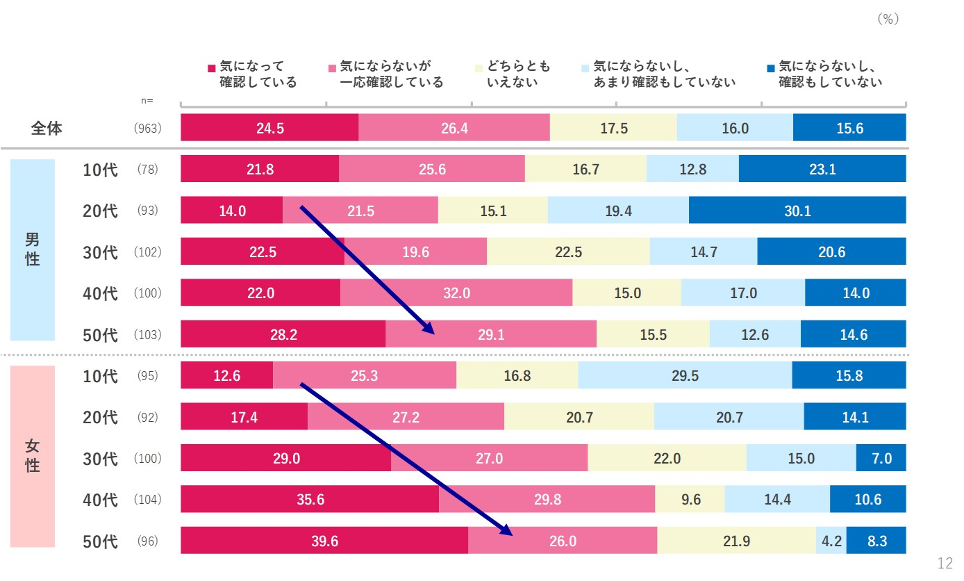 性年代別では、男性20代でTOP2(「気になって確認している」「一応確認している」)35.5%と最も低く、年代が上がるに連れて増え、50代で57.3%と最も高くなっています。女性では、10代でTOP2が37.9%と最も低く、男性と同じく50代で65.6%と最も高くなっています。