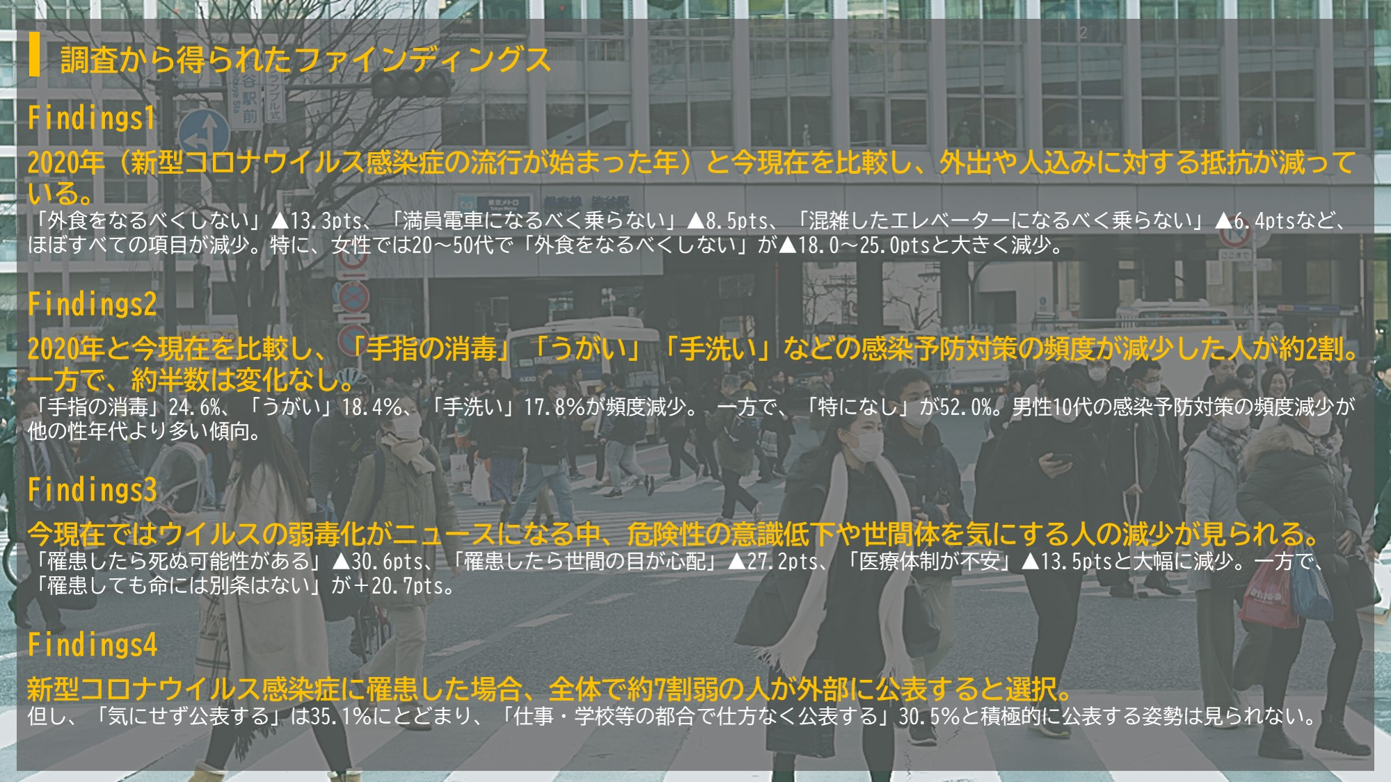 2020年1月16日、国内で新型コロナウイルスの感染者が初めて確認されて以降、2023年1月現在でも感染拡大が続いており、収束の見通しは立っていません。引き続き、新型コロナウイルスの流行は人々の暮らしや意識に多大なる影響を及ぼしています。