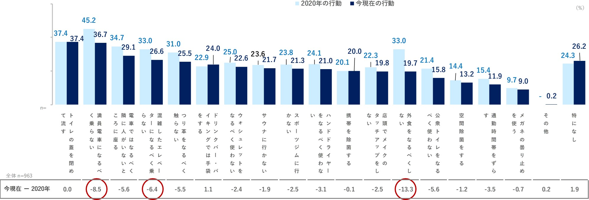 2020年と比較し、外出や人込みに対する抵抗が減っている。「外食をなるべくしない」▲13.3pts、「満員電車になるべく乗らない」▲8.5pts、「混雑したエレベーターになるべく乗らない」▲6.4ptsなど、ほぼすべての項目が減少。