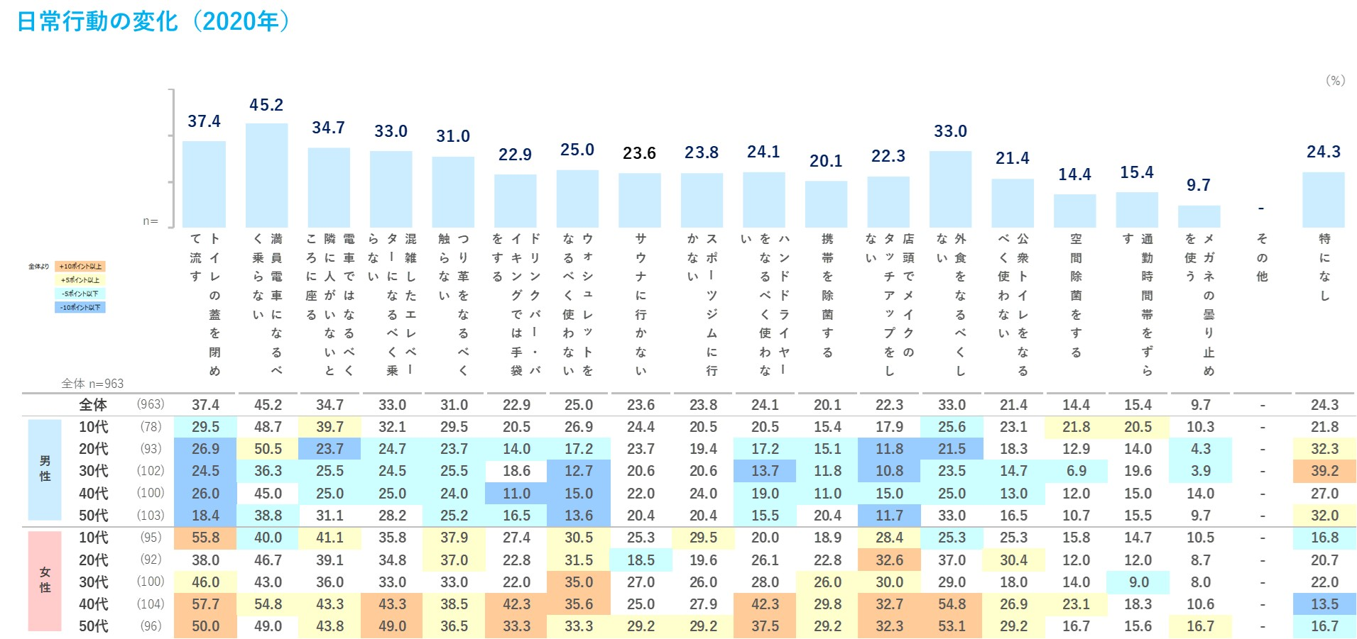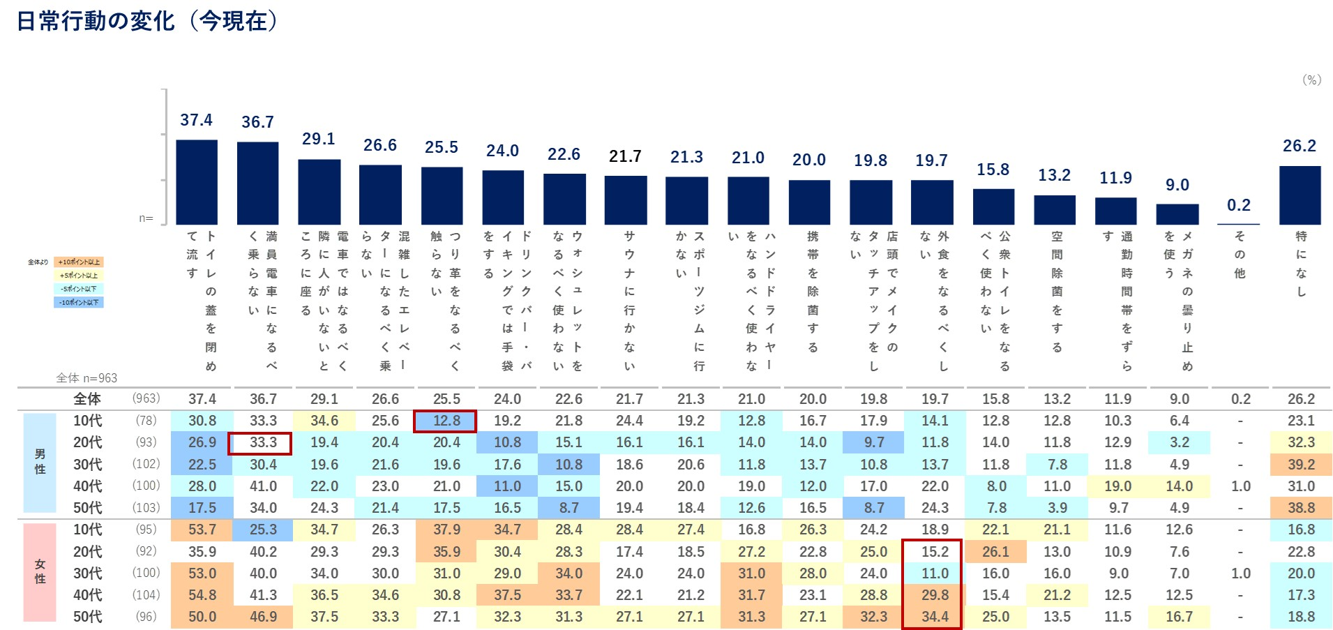 2020年時と今現在での行動実態を聴取し、どのような変化があるのか確認しました。性年代別では、女性20~50代で「外食をなるべくしない」が▲18.0~25.0ptsと大きく減少しています。男性では、20代「満員電車になるべく乗らない」▲17.2pts、10代「つり革をなるべく触らない」▲16.7ptsが特に減少しています。