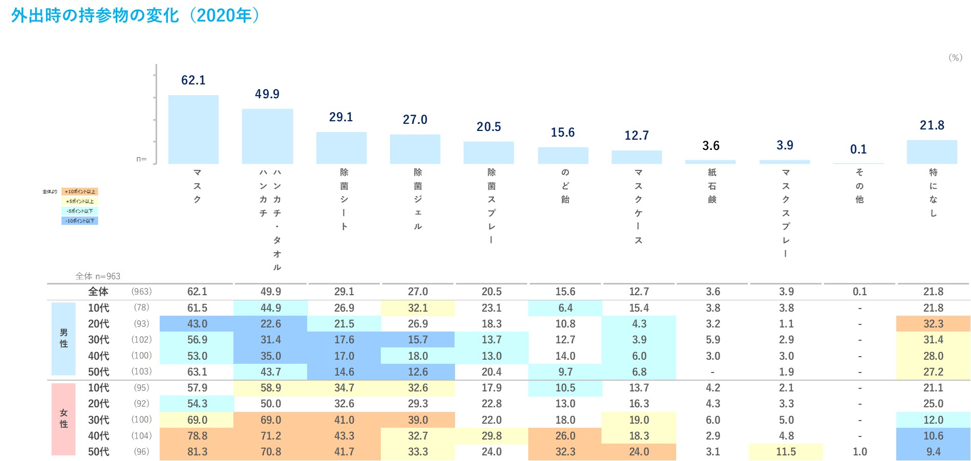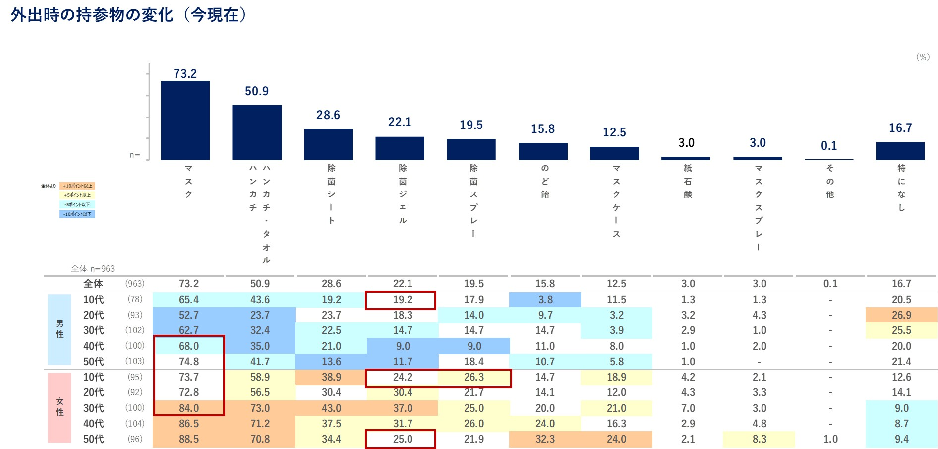 続いて、外出時の持参物にどのような変化があるのかを確認しました。「マスク」は男性40・50代、女性10~30代で+11.7~18.5ptsと大きく上昇しています。10代女性の「除菌スプレー」は+8.4pts。「除菌ジェル」は10代男性▲12.9pts、女性10代・50代で▲8.3~8.4pts減少していました。