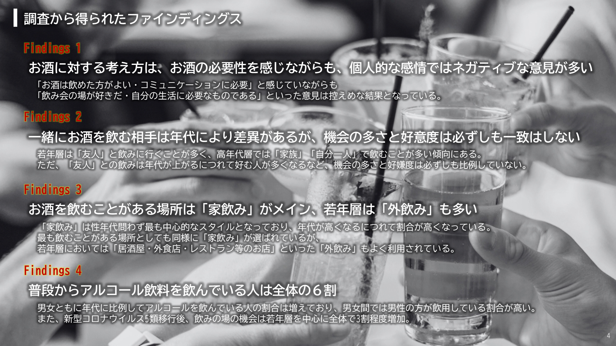 そこで、日本インフォメーション株式会社(代表取締役社長:斎藤 啓太 以下、日本インフォメーション)では、コロナ禍を経た今、人々のアルコール飲料に対する意識がどのように向けられているのか等、性年代別での実態を把握するために本調査を実施しました。