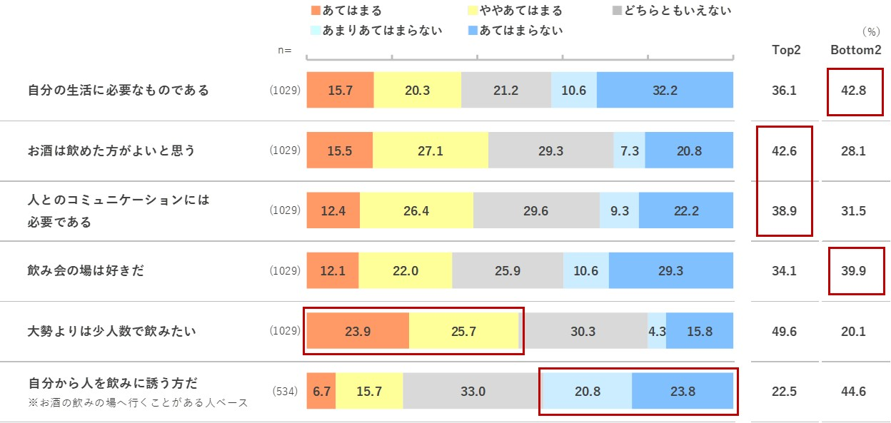 「自分の生活に必要なものである」はBottom2が4割でTop2を上回っています。また「飲み会の場は好きだ」もBottom2が4割でTop2を上回っており、お酒の必要性を感じつつも、個人の感情としてはお酒に対するネガティブな意識も持つ人が多いことが窺えました。