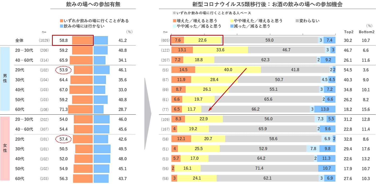 自分一人を含め、日常で飲みの場へ足を運ぶことがある人は全体で約6割。男性は20代がやや低く、女性はいずれも5割台にとどまるが20代が57.4%で最も高い。