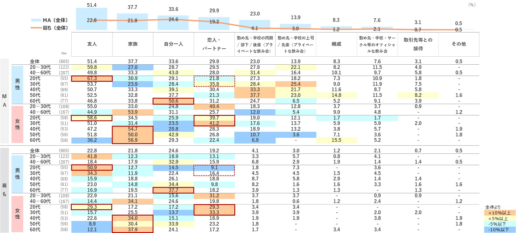 飲みの場に参加することがあると回答した人を対象に、「一緒に飲みの場に行くことがある人」を聴取しました。「最も」では、「自分一人」が2割半ばで高くなっています。「友人」は20代男女、「家族」は女性40-60代、「自分一人」は男性60代で高いのが特徴的です。また「恋人・パートナー」は女性20-30代で高いですが、同年代の男性とは大きく差が開いた結果となりました。