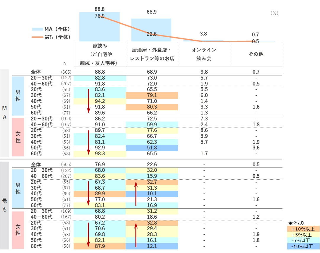 お酒を飲むことがある場所は、性年代問わず「家飲み(ご自宅や親戚・友人宅等)」が中心で、男女とも比較的年代が上がるにつれて高くなっている。