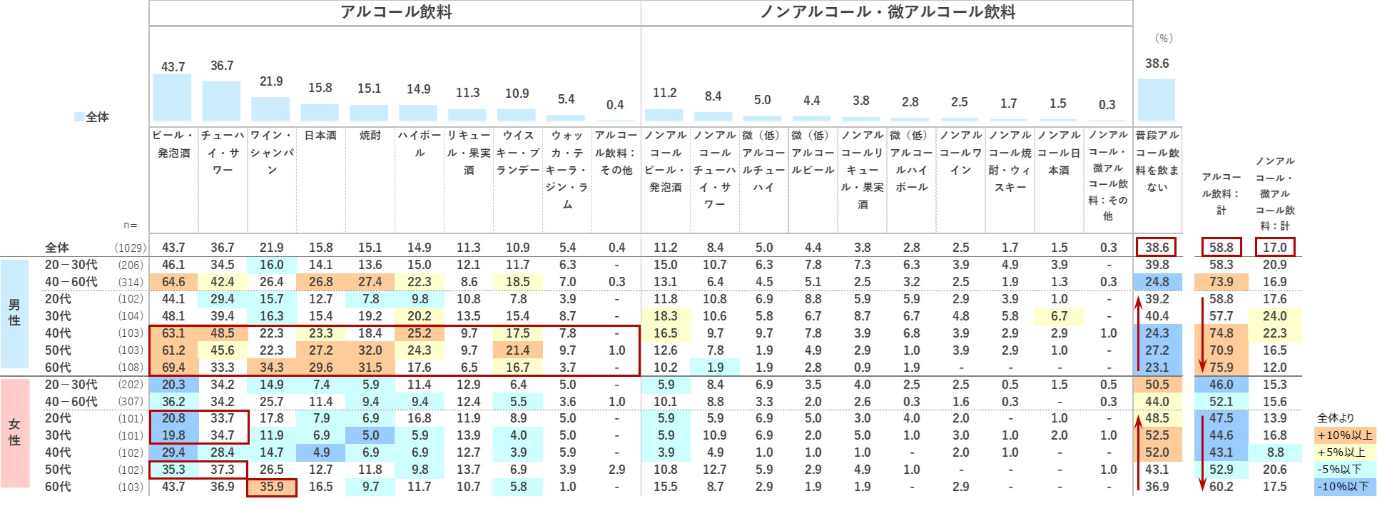 「アルコール飲料」の飲用は男性が高く、また男女とも年代に比例して飲用率が高まっています。男性40-60代は比較的様々な種類のアルコールを飲用しており、女性は若年中心に「チューハイ・サワー」が「ビール・発泡酒」以上に飲まれており、また女性60代は「ワイン・シャンパン」も3割台と比較的高い結果でした。