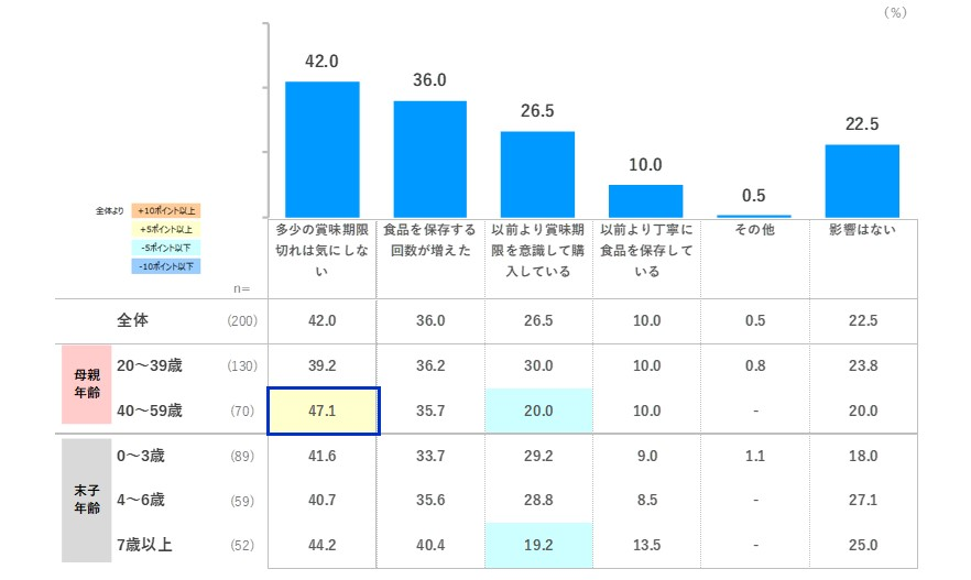 ■全属性で影響を受けていますが、母親年齢「40 ~ 59歳」で「多少の賞味期限切れは気にしない」が全体より+5.1ptsとなっています。