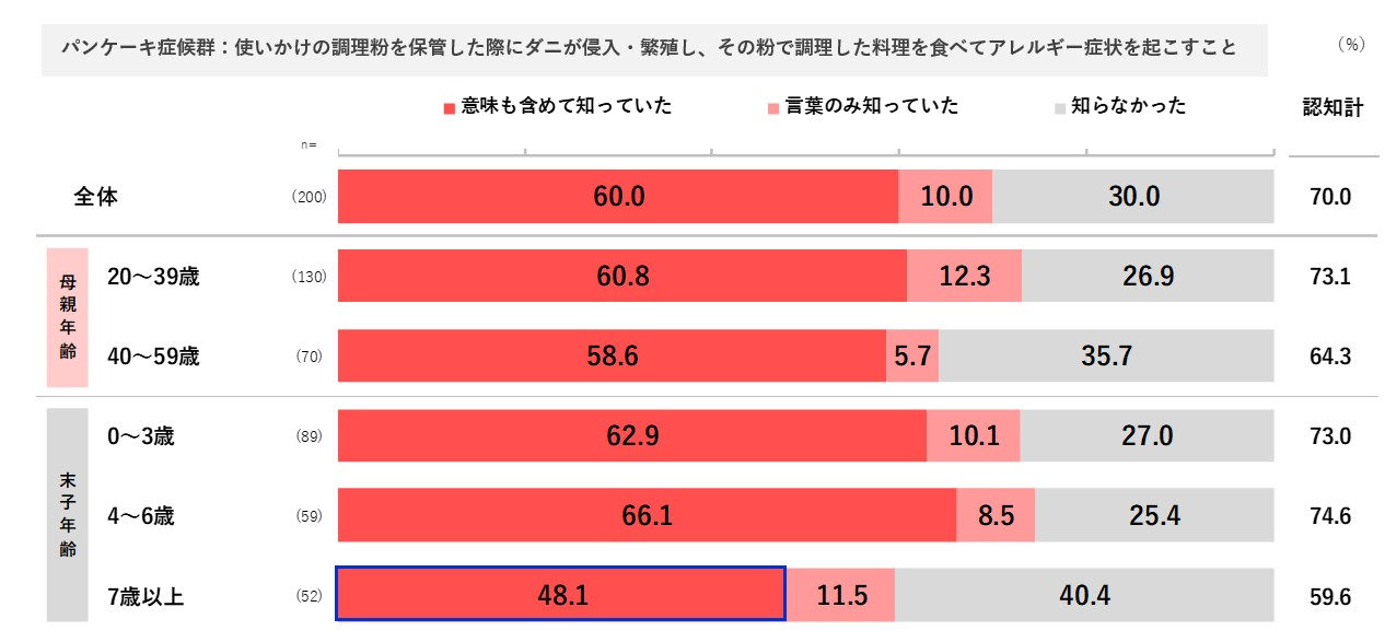 夏の時期に特に注意が必要な「パンケーキ症候群」について、認知を確認したところ、「意味も含めて知っていた」「言葉のみ知っていた」は7割。「知らなかった」は3割。