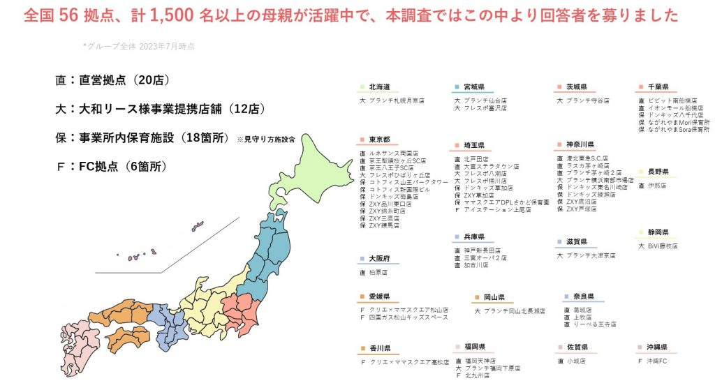 ママスクエアは全国57拠点に展開しており、通勤に時間をかけない職住接近を実現しております。共働き世帯が増えている中、顕在化しにくい働くママや子どもの内なる声などへのアプローチが可能です。女性・ママ・子どもへのリサーチにご興味をお持ちの方は、是非以下よりお問い合わせください。