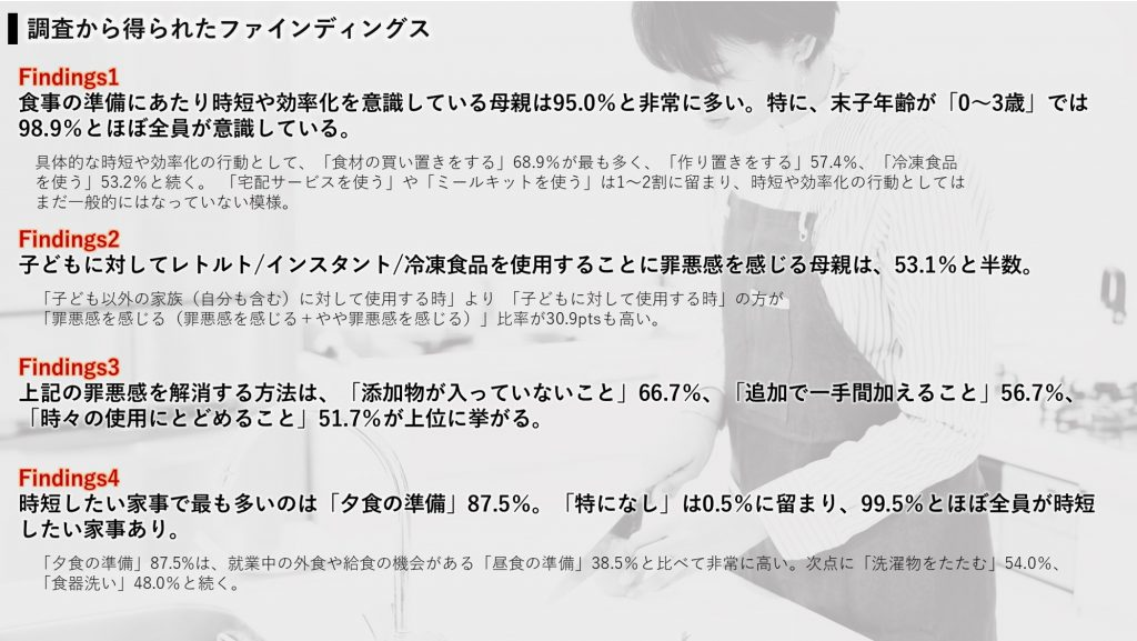 今回の調査からは、子育てをしながら働く女性にとって、食事の準備を時短することは必須の要件でありながらも、レトルト食品などの使用に罪悪感を感じる悩める様子が垣間見えました。時短ニーズの強さゆえに、罪悪感を軽減/解消できる商品が開発が望まれているともいえるでしょう。