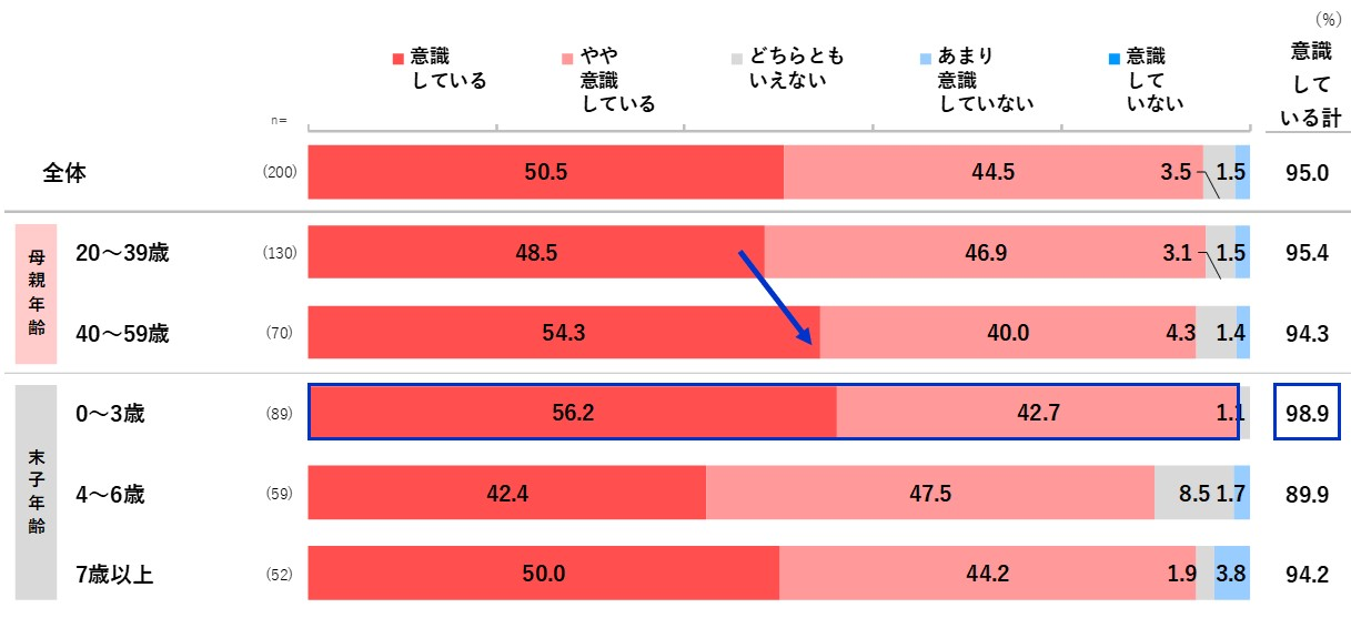 ■Top BoxおよびTop 2 Boxともに最も高いのは末子年齢「0~3歳」で、 Top Box 56.2%、 Top 2 Box 98.9%となっています。母親年齢が「20~39歳」より「40~59歳」の方が「意識している(Top Box)」は+5.8pts高いものの、Top 2 Boxではほぼ同等です。