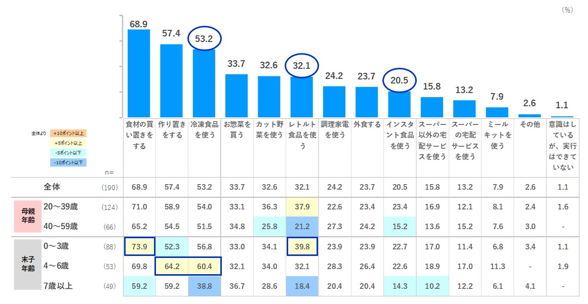 「食材の買い置きをする」68.9%が最も多く、「作り置きをする」57.4%、「冷凍食品を使う」53.2%と続く。 「宅配サービスを使う」や「ミールキットを使う」は1~2割に留まり、時短や効率化の行動としてはまだ一般的にはなっていない模様。
