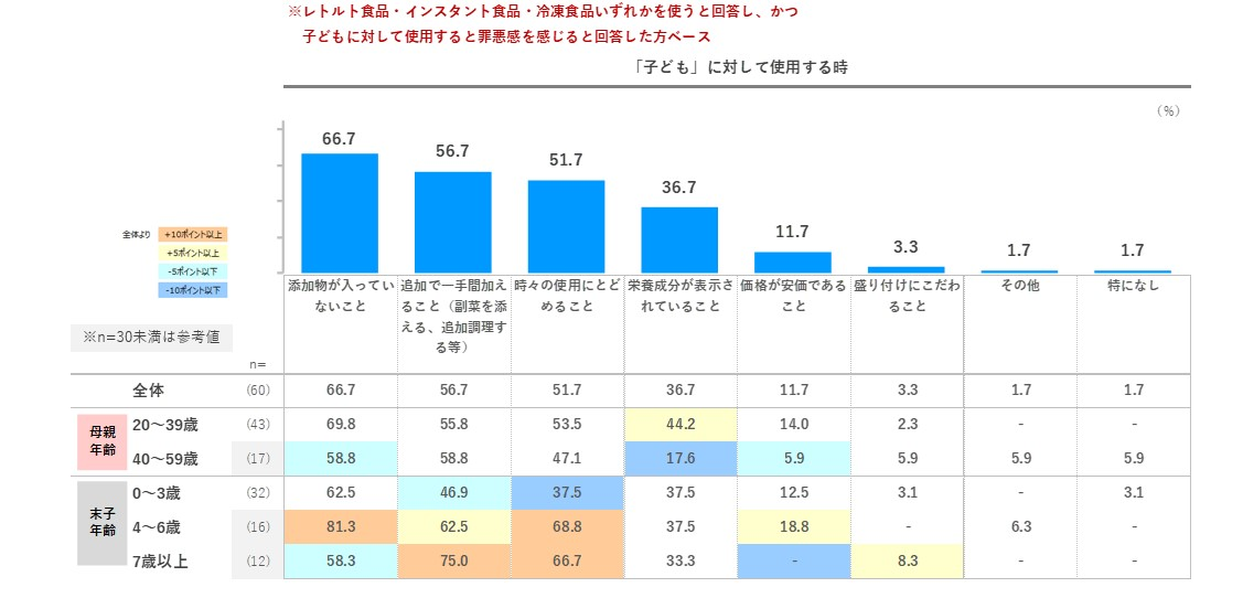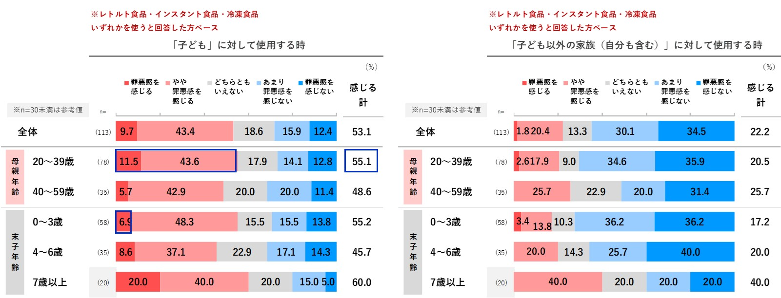 子どもに対してレトルト食品・インスタント食品・冷凍食品を使用することに罪悪感を感じる母親は53.1%と半数、 「子ども以外の家族(自分も含む)に対して使用する時」より +30.9ptsも高い。