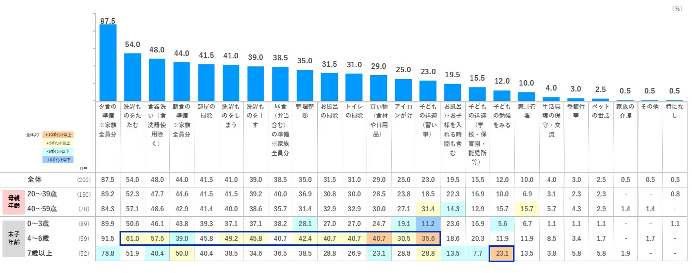 ■末子年齢「4~6歳」で全体より高い項目が多く、 「子どもの送迎(習い事)」が+12.6pts、 「買い物(食材や日用品)」+11.7pts、「トイレの掃除」+9.7ptsなどでした。「7歳以上」では「子どもの勉強をみる」で+11.1ptsとなっています。子どもの成長に応じて、時短したい家事は変化しています。