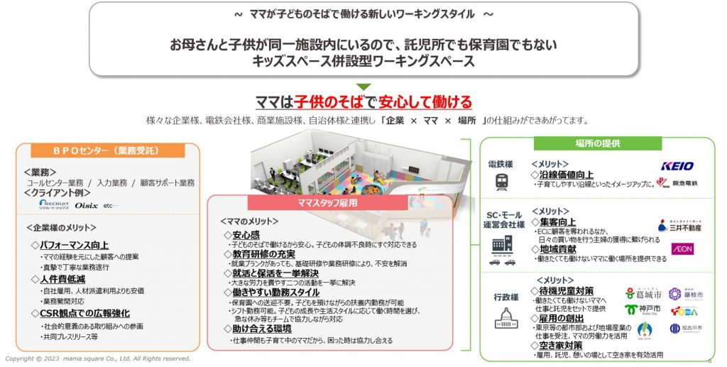 ママスクエアのママは、子どものそばで働くことが可能な、キッズスペース付きワーキングスペースで、働いています。