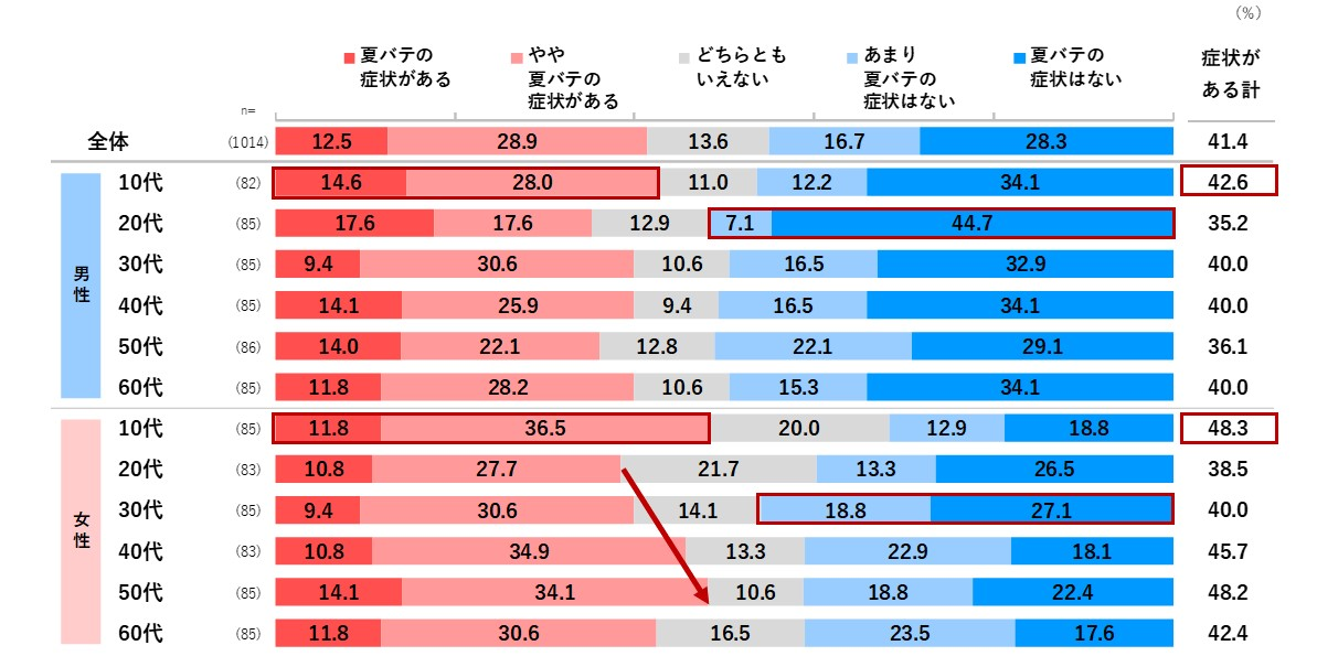 Top 2 Box (「症状がある」「やや症状がある」)は全体で41.4%。男女とも10代のT2Bが最も高い(男性:42.6%、女性:48.3%)。 男女別のTop 2 Boxの値をみると、女性の方が夏バテを感じた人が多い。