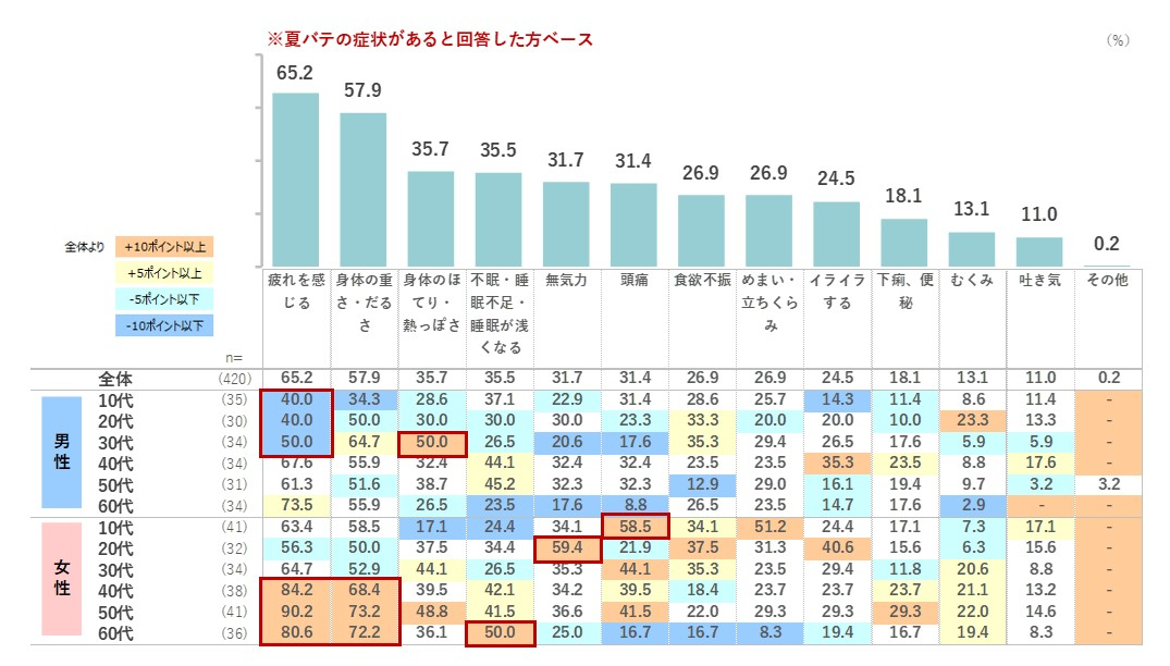 主な症状は、「疲れを感じる」65.2%、「身体の重さ・だるさ」57.9%。特に女性40代以上の7-9割がこれらの症状に該当し、全体よりも10.5~25.0pts高い。各性年代で感じやすい症状は異なるが、女性の方が夏バテを感じていた分(Q1参照)、女性の方が該当する症状が多く幅広い傾向。