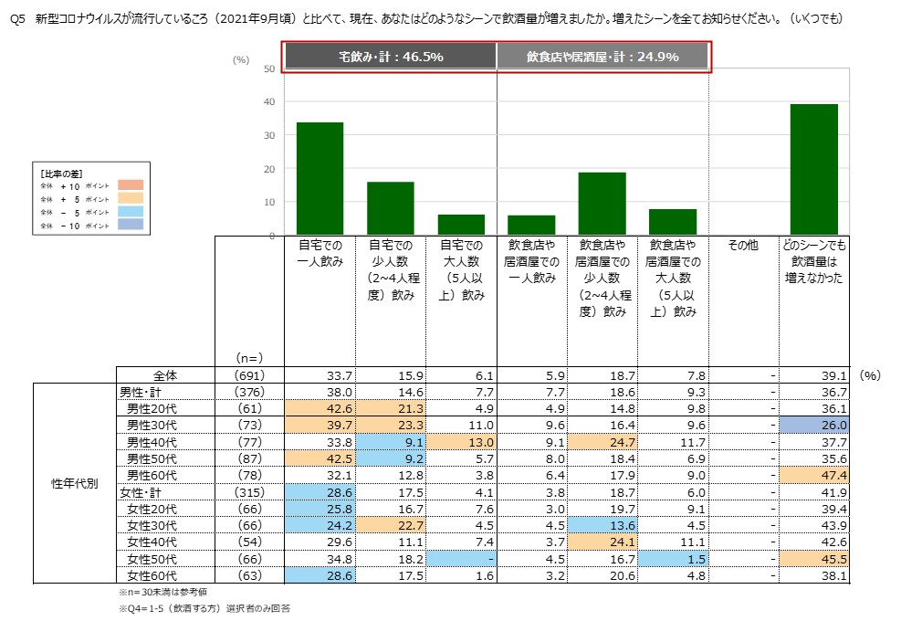 ・飲酒が増えたシーンでは、全体では「自宅での一人飲み」が最も高くなっています。