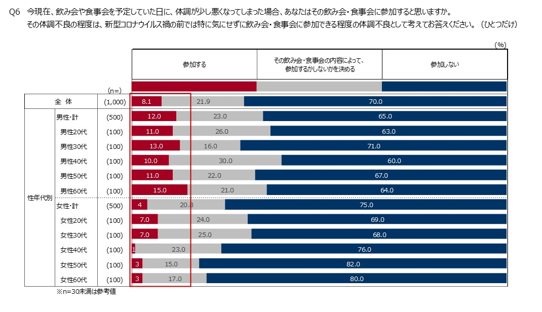 ・体調が少し悪い場合、「予定していた飲み会・食事会を見送る」のは全体では7割でした。