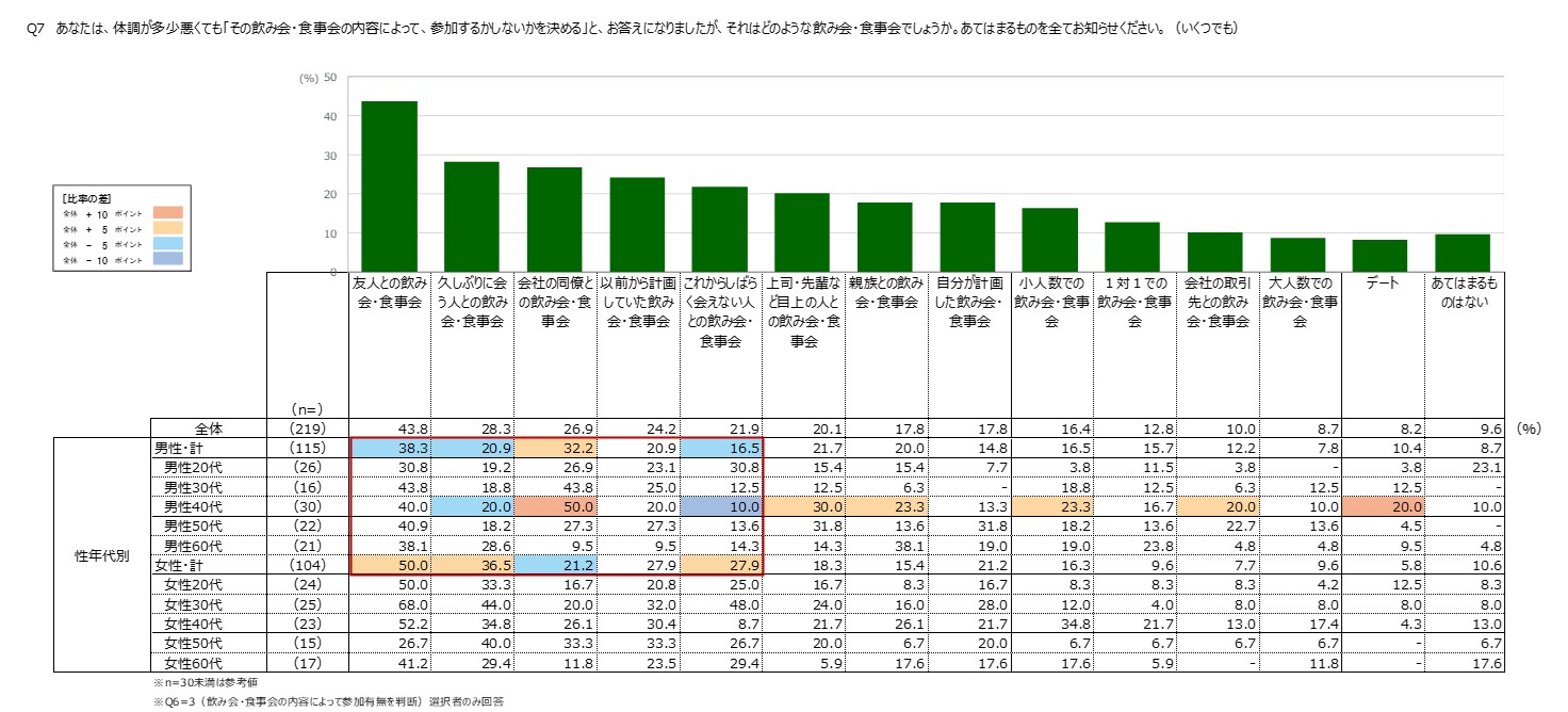 ・体調が少し悪い場合、参加を検討する飲み会は、全体では「友人との飲み会・食事会」が4割と最も高くなっています。特に女性でスコアが高い傾向です。