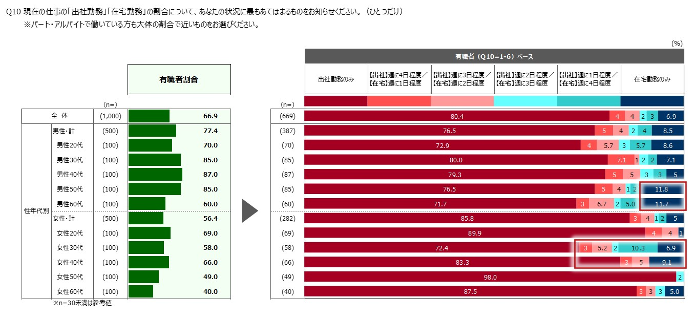 ・有職者(パート・アルバイト含)は66.9%で、そのうちの8割が「出社勤務のみ」となっています。また、有職者のうち、13%は「出社勤務」「在宅勤務」を組み合わせたハイブリッド型の勤務スタイルとなっています。