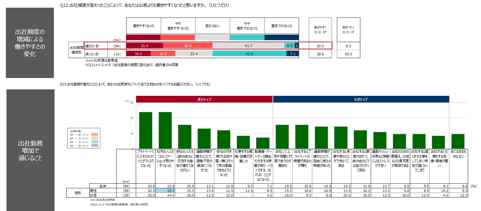 ・「出社頻度の増減」で「多くなった~やや多くなった」と回答したうちの半数は「働きやすくなった~やや働きやすくなった」と回答しています。