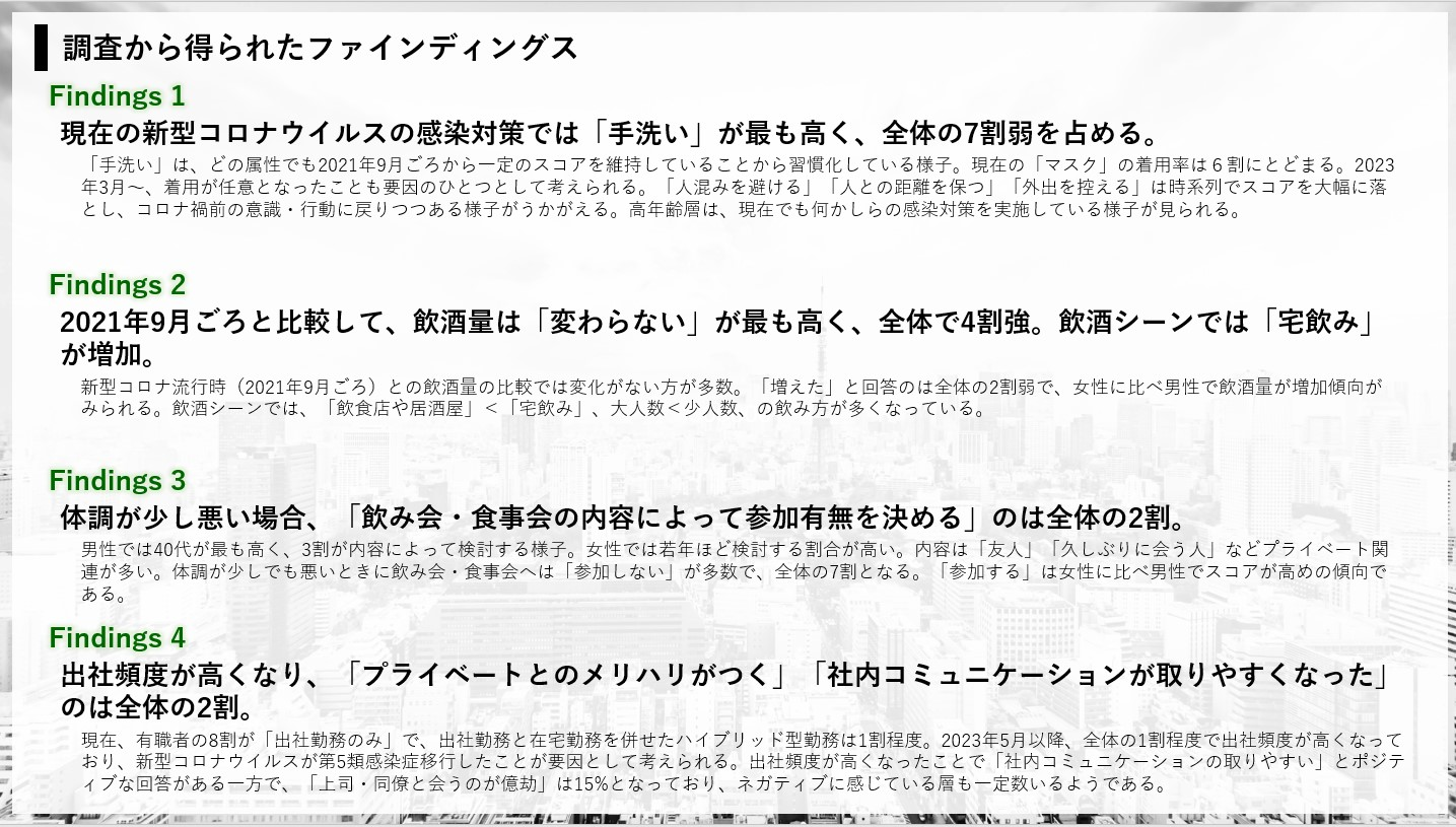 そこで、日本インフォメーション株式会社(代表取締役社長:斎藤 啓太 以下、日本インフォメーション)では、新型コロナウイルスに対する感染対策などの行動や意識を、「2021年9月頃(第5波 デルタ株蔓延時)」「2023年5月頃(「第5類感染症」に移行時)」と比較し、現在の状況を把握するために調査を実施しました。また、今回の調査では、新型コロナウイルスによって変化した飲酒シーンや働き方の現状把握も行いました。