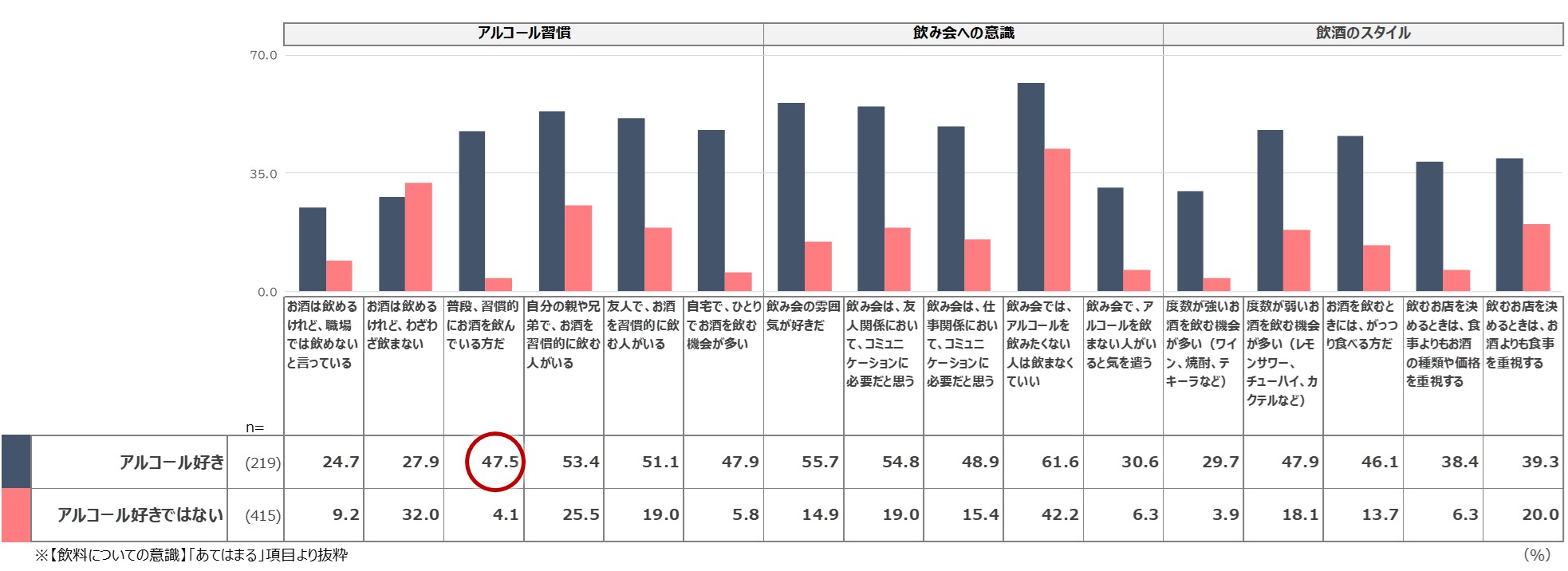 アルコール習慣を見ていくと、アルコール好きの5割弱が「習慣的にお酒を飲んでいる」と回答しています。友人や家族など周りに習慣的に飲む人が多いのも特徴です。ひとりでお酒を飲んでいる方も多いようで、Z世代といえども好きな人にとってアルコールは、身近な存在のようです。