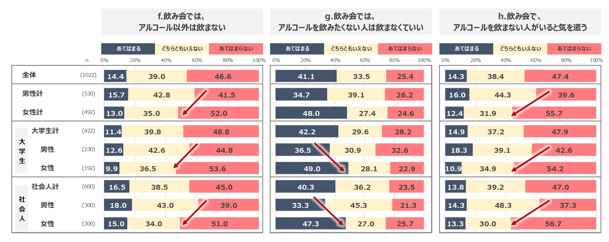 続いて、飲み会への意識を確認しました。Z世代全体と比べて、「飲み会参加への好意的姿勢が目立ち、周囲が飲むか否かもさほど気にしてなく、多様なスタイルを許容している様子が窺えます。