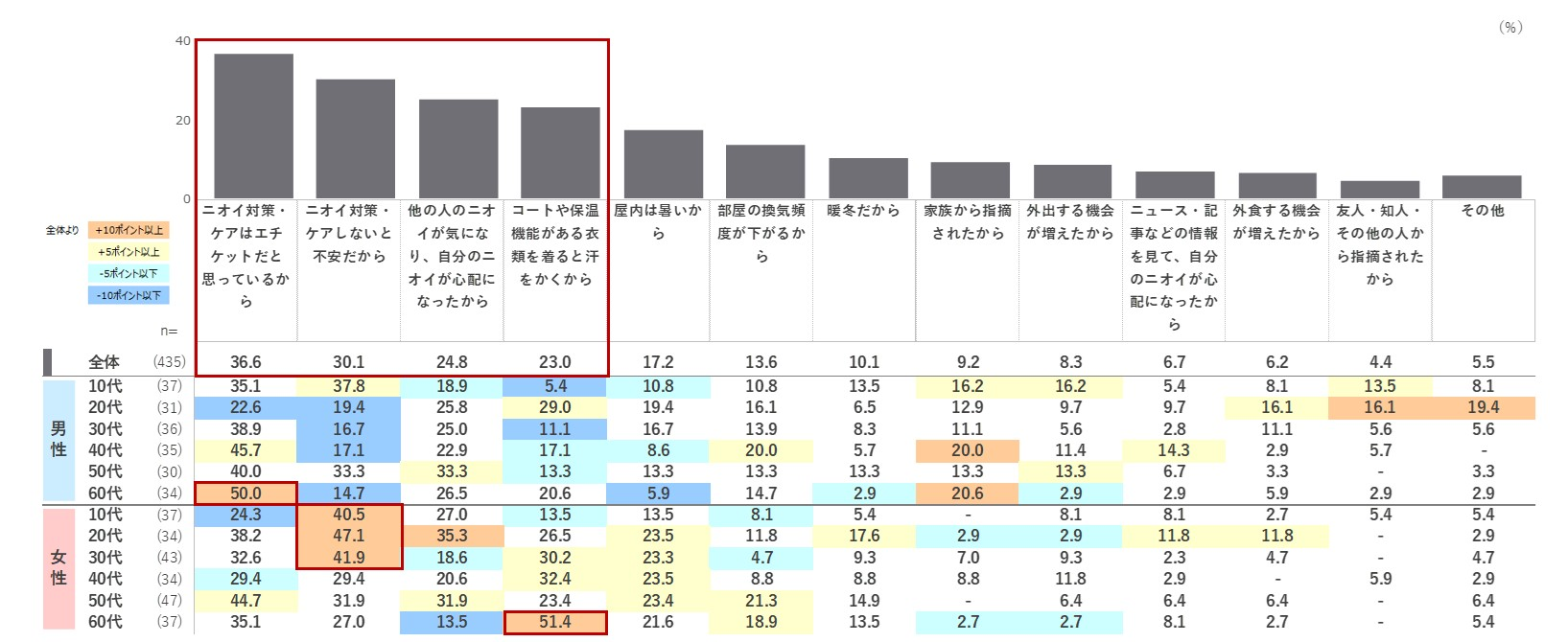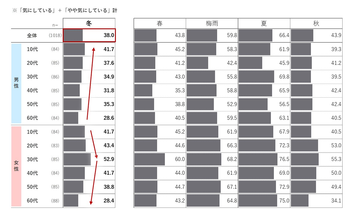 冬にニオイを気にしている人は、年間では最も低いものの全体で約4割です。