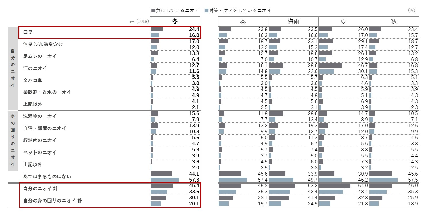 自分のニオイ・自分の身の回りのニオイともに、冬は春秋と同等以上にいずれかのニオイを気にしている割に、対策・ケアはされていません。