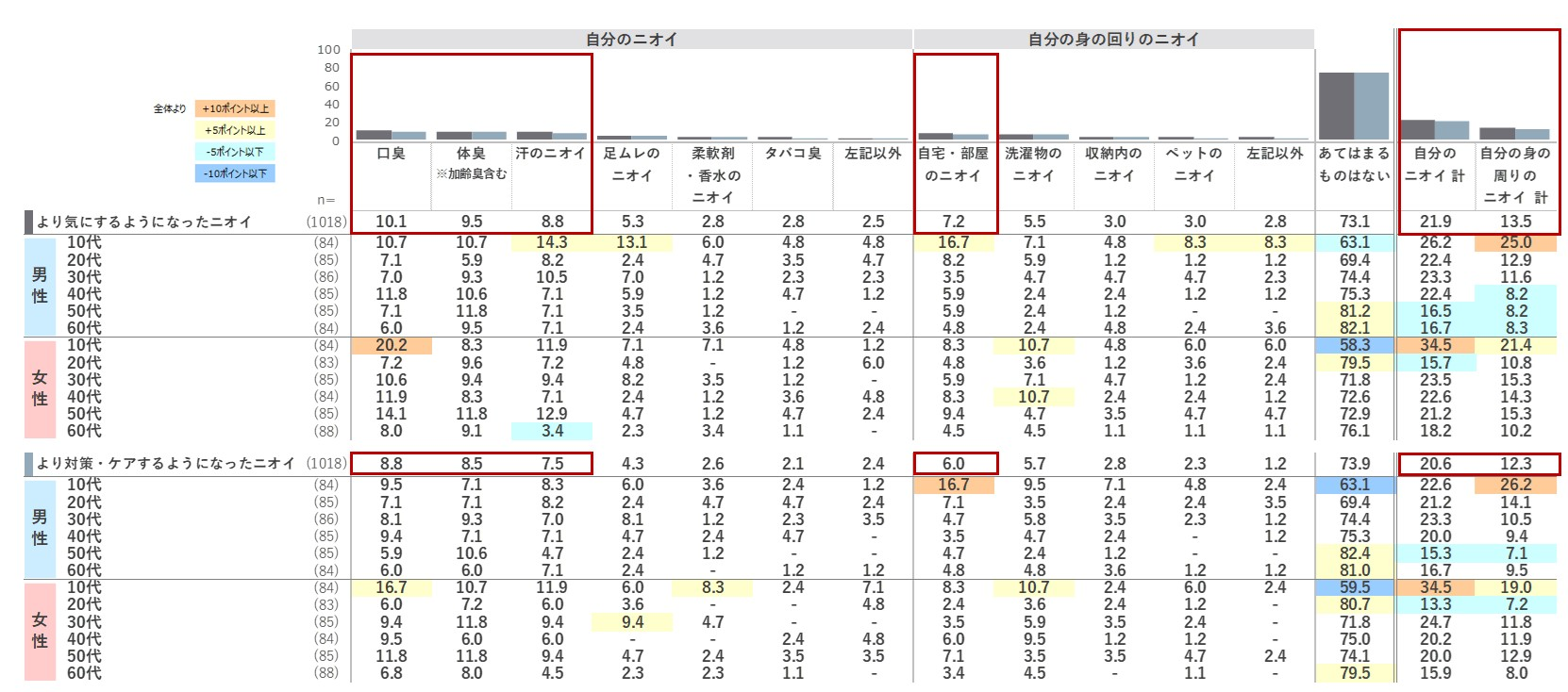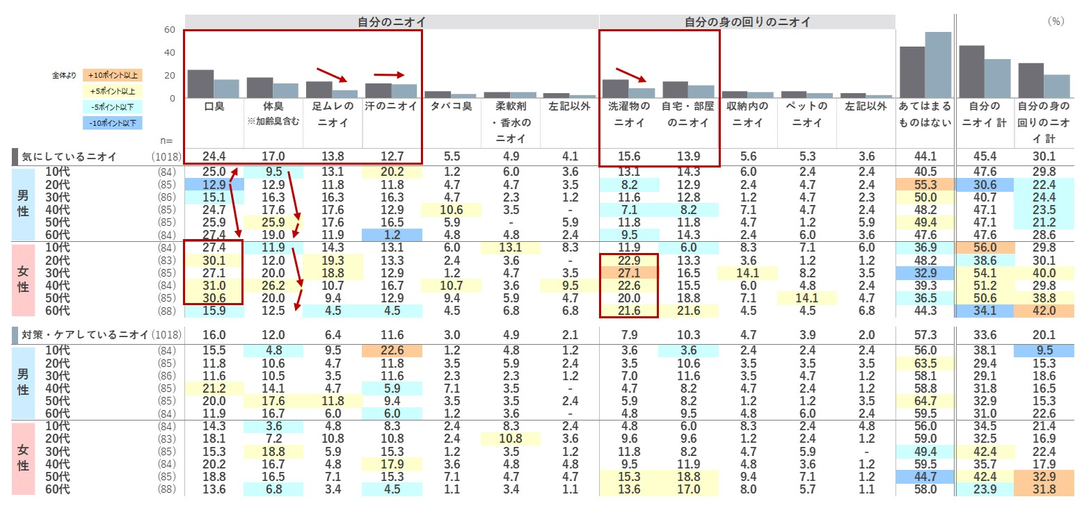 最も高い「口臭」は24.4%でした。「体臭、足ムレ、汗、洗濯物、自宅・部屋のニオイ」が1割台で続きます。「口臭」は女性は50代まで3割程度と高く、男性は年代に比例して高まる中、10代が25%と高い水準です。「体臭」は男性は50代、女性は40代がピークです。「洗濯物」については女性20代以上のスコアが高くなっています。