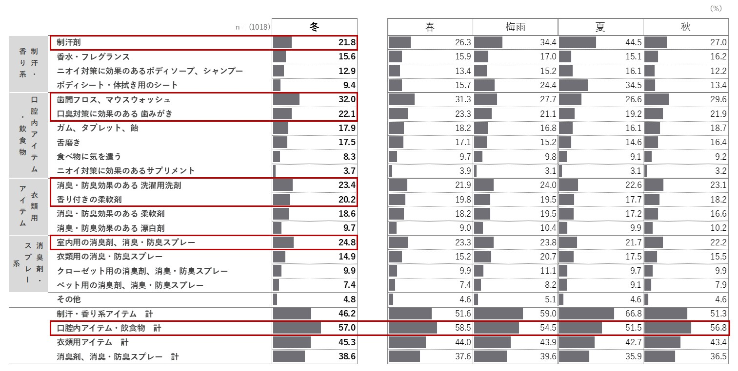 ここまで冬のニオイ対策について見てきましたが、春夏と比べると、気にしているニオイの種類や対策意識の違いが出ていました。