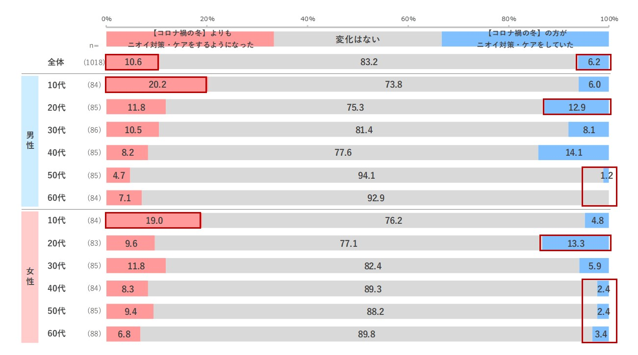 コロナ禍の冬と比べ、この冬に更にニオイ対策・ケアをするようになったのは全体の1割で、コロナ禍の方がニオイ対策・ケアをしていた6.2%を上回ります。