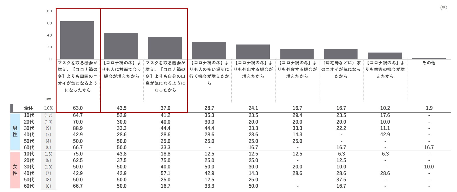 「マスクを取る機会が増え、より周囲のニオイが気になるようになったから」が6割超です。その他「対面で会う機会が増えたから」 「マスクを取る機会が増え、自分の口臭が気になるようになったから」という理由が上位に挙がりました。