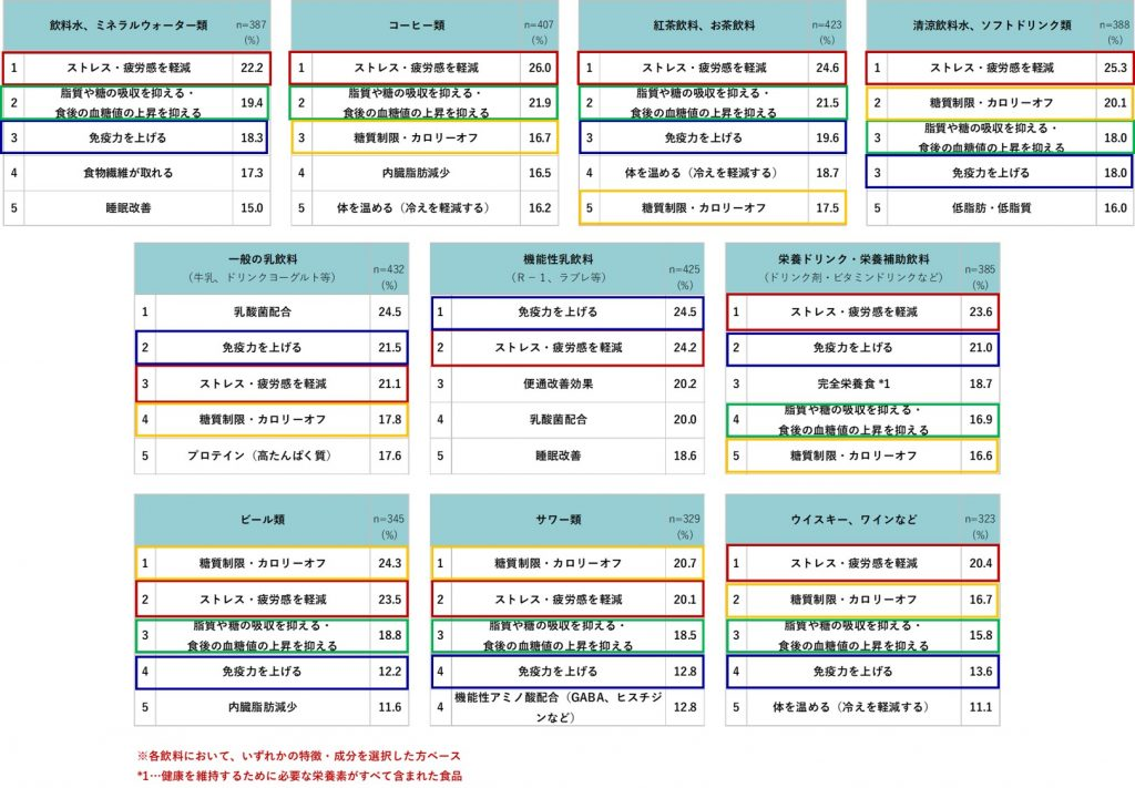 全10カテゴリーで上位3位以内に「ストレス・疲労感を軽減(2-3割)」が入っており、飲料カテゴリーで最もポピュラーな特徴と言える。その他、食品に続き「脂質や糖の吸収を抑える・食後の血糖値の上昇を抑える(2割)」は8カテゴリーで上位4位以内に入っている。