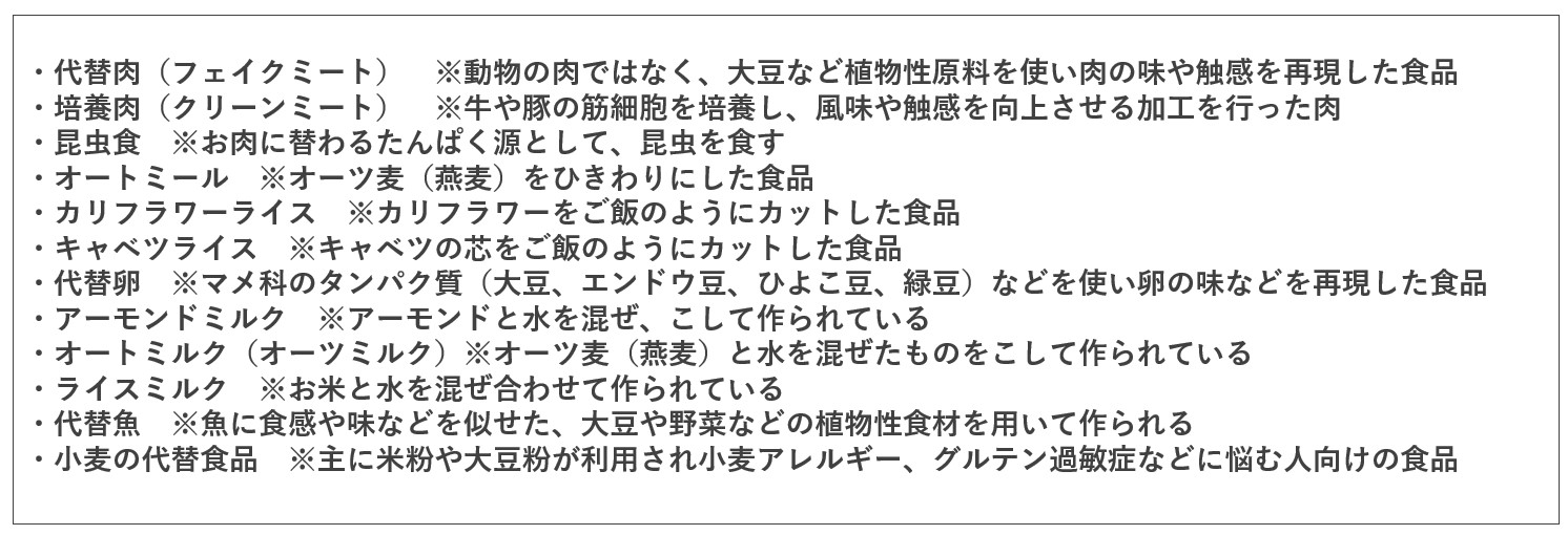 新型コロナウイルス感染症を踏まえた健康志向の高まりを背景に、「代替食」や「完全栄養食」が注目されています。日本でも以前よりマーガリンなど“高価な食材を手頃な価格で味わうこと”を目的とした「代替食」が存在していましたが、近年はアレルギーやヴィーガン、健康志向の高い方に向けた“価格より美味しさ”に重点を置いた代替食が目立つようになりました。代替食には低脂質・低カロリーといった健康上のメリットや、製造・販売する企業のイメージ向上など様々なメリットがある一方、特定の栄養が不足する、添加物・化学物質の摂取などのリスクも懸念されています。