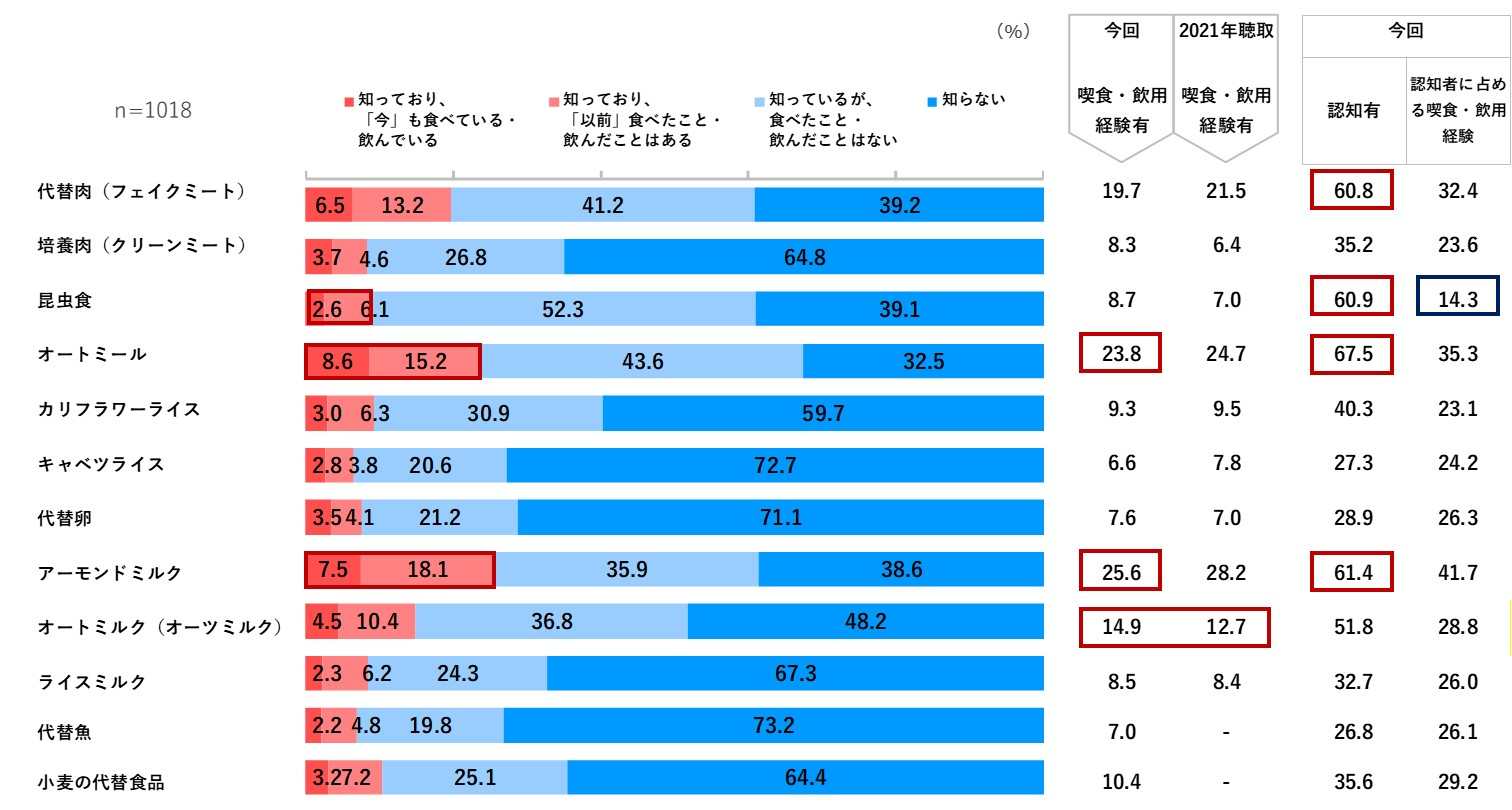 認知もまだ全体的に高いとは言えず、6割を超えるものは「オートミール」67.5%、「アーモンドミルク」61.4%、「昆虫食」60.9%、「代替肉(フェイクミート)」60.8%のみ。認知者における喫食・飲用経験は各代替食とも約3-4割だが、「昆虫食」は14%と最も低く消費者の抵抗が高い様子が伺える。