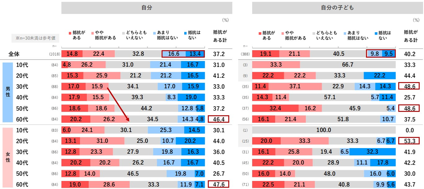 「自分」よりも「自分の子ども」に対して抵抗を感じる人が多い傾向。 「自分の子ども」に抵抗を感じる人は、男性30・50代、女性20代で5割(+8.4~13.1pts)。