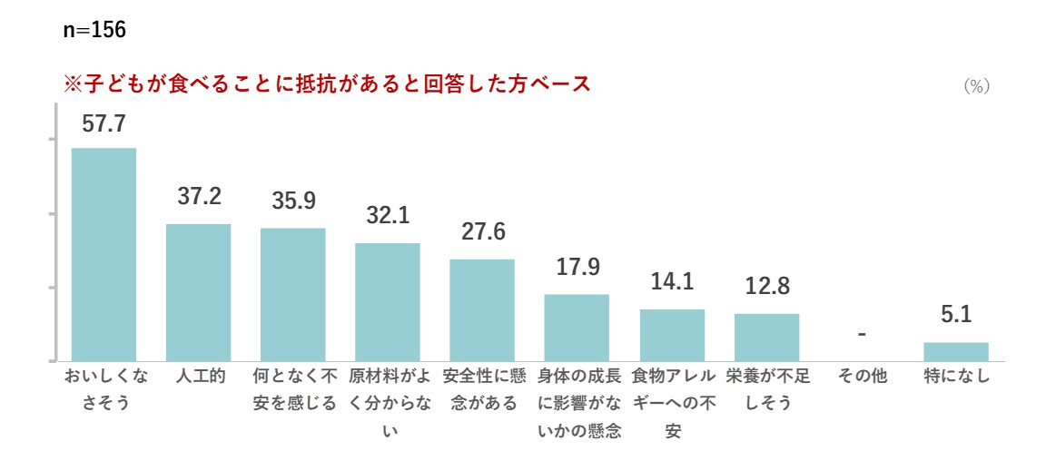 「おいしくなさそう」57.7%の次点として、「人工的」37.2%、「何となく不安を感じる」35.9%が続きます。「原材料がよく分からない」32.1%、「安全性に懸念がある」27.6%、「身体の成長に影響がないかの懸念」17.9%など安全性に関する理由は2-3割ほどでした。