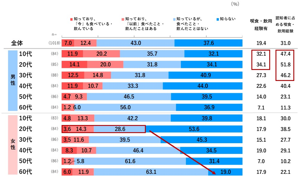喫食・飲用経験は、男性10代(全体より+12.8pts)、男性20代(+14.8pts)が特に高いです。認知者に占める喫食・飲用経験の割合は全体で31.0%ですが、男性10代(47.4%, 全体より+16.3pts)、男性20代(51.8%, +20.8pts)に加えて、男性30代(46.2%, +15.1pts)も多いです。女性は年代があがるにつれて認知自体は高くなるものの喫食・飲用経験は伸びておらず、喫食・飲用経験も全体(19.4%)を超える年代はありません。
