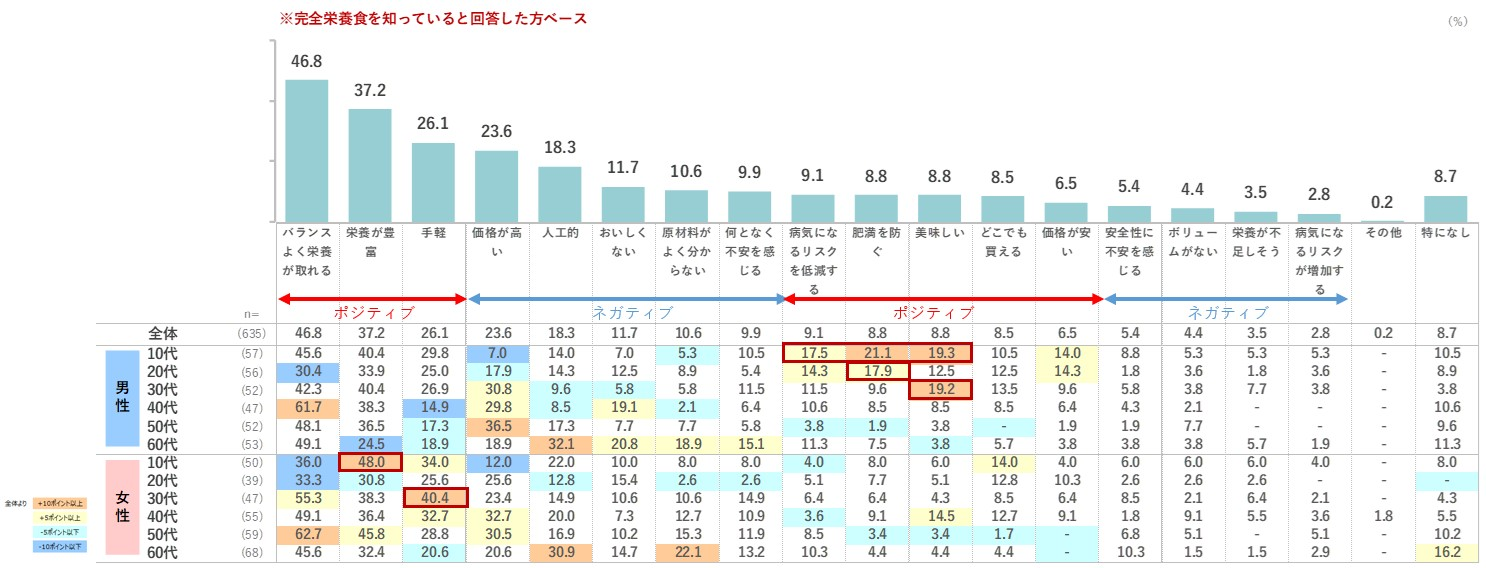 「バランスよく栄養が取れる」46.8%、「栄養が豊富」37.2%、「手軽」26.1%とポジティブなイメージが上位3つを占める。一方で、4-8位は「価格が高い」23.6%、「人工的」18.3%などネガティブなイメージが続く。