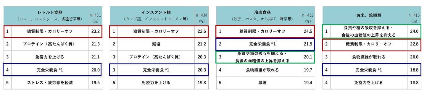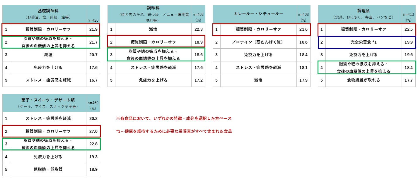 食品全9カテゴリーで上位2位以内に「糖質制限・カロリーオフ(2-3割)」が、飲料では全10カテゴリーで上位3位以内に「ストレス・疲労感を軽減(2-3割)」が入っている。