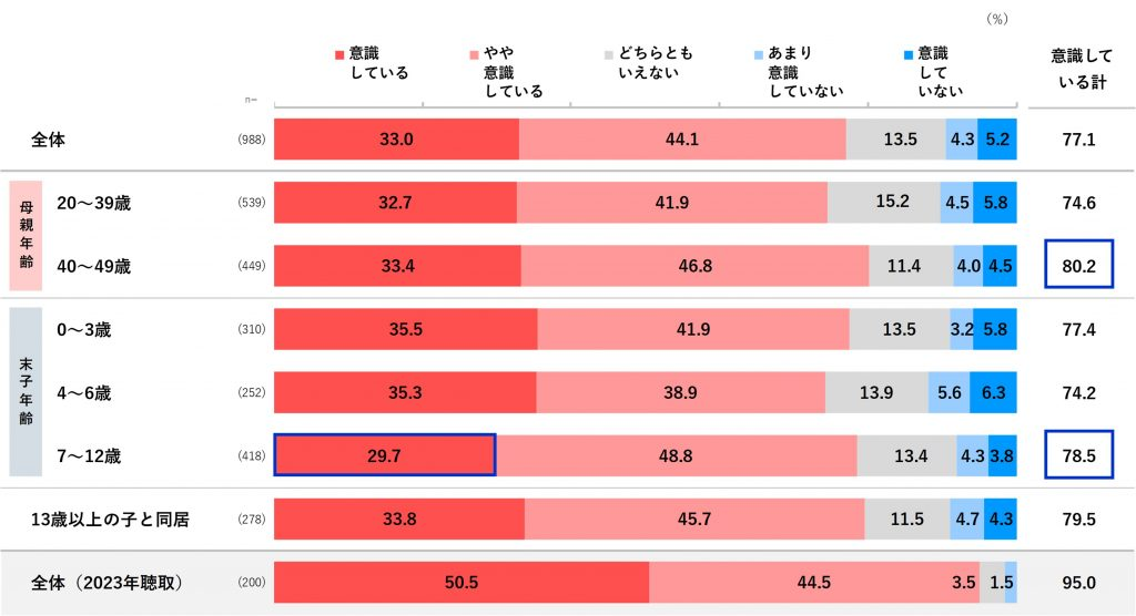 全体的に属性別で大きな差異はありませんが、Top 2 Boxにて「母親年齢:40~49歳」の方が「母親年齢:20~39歳」より5.6pts高くなっています。但し、Top Boxは3割と同程度です。末子年齢別では、 「末子年齢:7~12歳」のT2Bが78.5%と 「末子年齢:4~6歳」より4.3pts高くなっていますが、 Top Boxは3割未満と「末子年齢0~3歳」「末子年齢4~6歳」の4割弱と比べて低くなっています。
