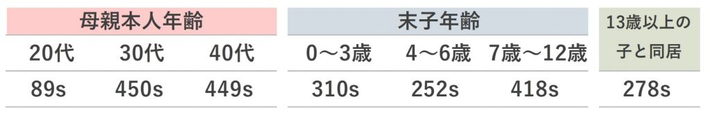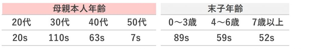 3番目に多い「部屋の掃除」36.9%に加えて、「トイレの掃除」32.9%、「お風呂の掃除」31.7%も3~4割あがっています。「末子年齢:4~6歳」の「朝食の準備」42.5%が全体より6.6pts高いものの、全体的に母親年齢や末子年齢で大きな差異は見られず「食事」「掃除」の負担はすべての属性で共通となっています。