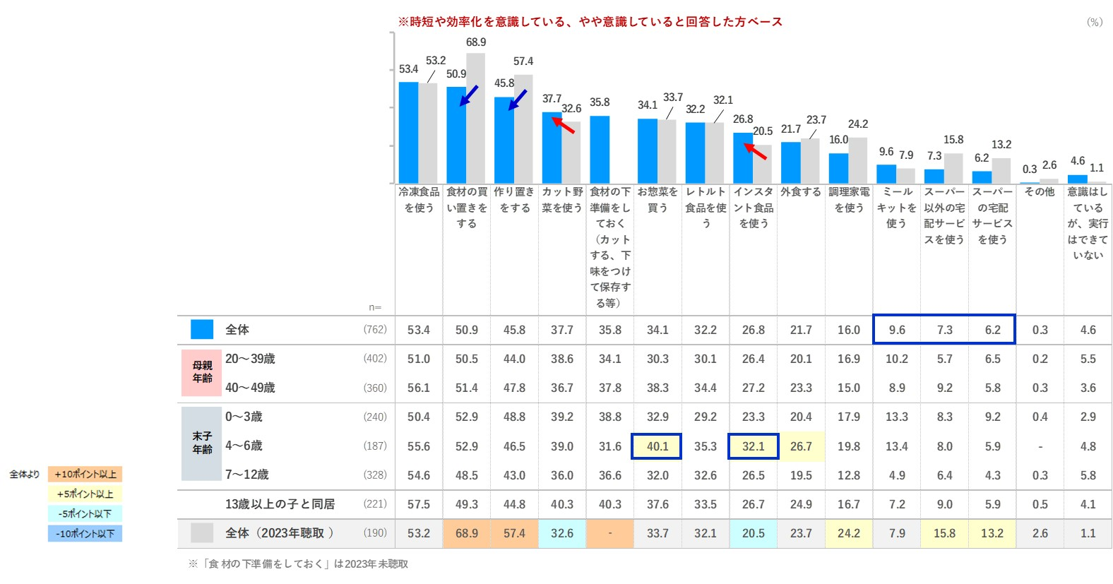 「インスタント食品を使う」26.8%(+6.3pts)、「カット野菜を使う」37.7%(+5.1pts)は昨年から増加しています。「末子年齢:4~6歳」では「お惣菜を買う」40.1%と全体より+6.0pts、「インスタント食品を使う」32.1%(+5.3pts)がやや高い傾向です。「ミールキットを使う」「宅配サービスを使う」は1割未満に留まり、時短や効率化の行動としては一般的にはなっていない模様です。