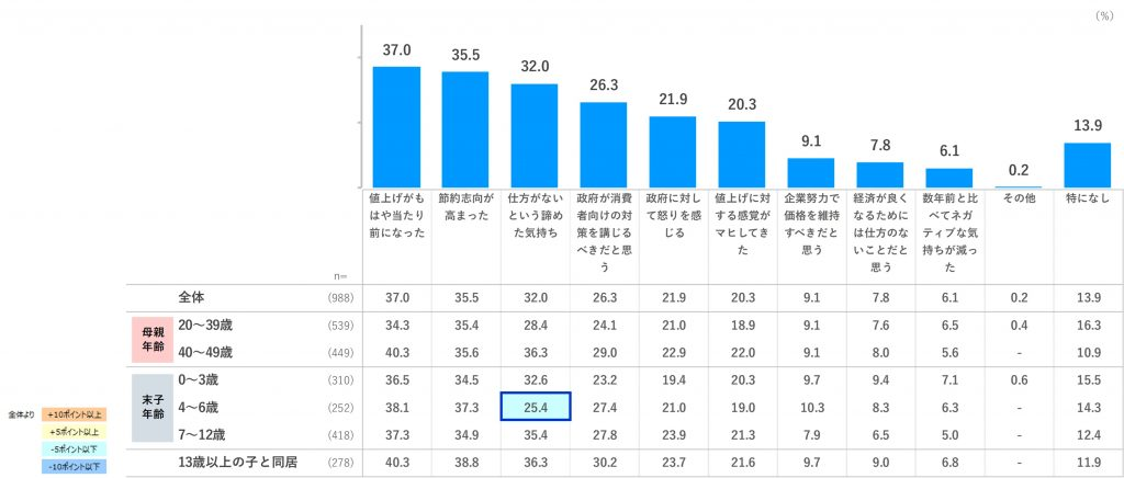 「値上げがもはや当たり前になった」37.0%、「節約志向が高まった」35.5%、「仕方がないという諦めた気持ち」32.0%が上位でそれぞれ3割以上。断続的に続く値上げへの感情として、政府に対する批判や要望よりも、仕方がなく受け入れて対応するといった姿勢や感情が見受けられる。