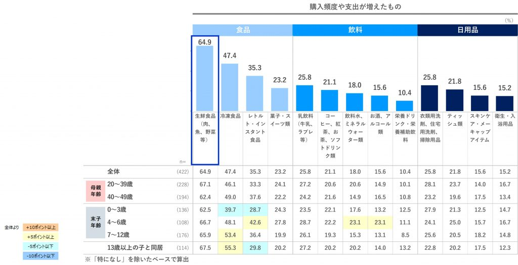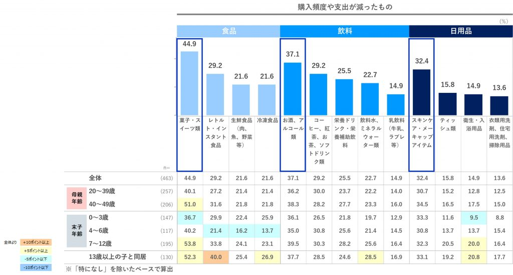 購入頻度・支出が増えたもの第1位は「生鮮食品」64.9%。一方で、購入頻度・支出が減ったものとして、食品「菓子・スイーツ類」44.9%、飲料「お酒、アルコール類」37.1%と嗜好品があがる。